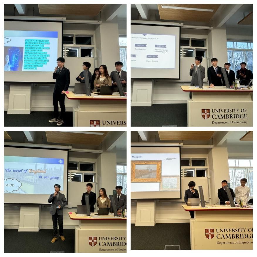 1月21日,研学营结营仪式于剑桥大学工程系举行。同学们以小组为单位进行汇报演讲,分享在学术课程、文化体验与个人成长方面的收获与思考,表达对未来发展的展望。